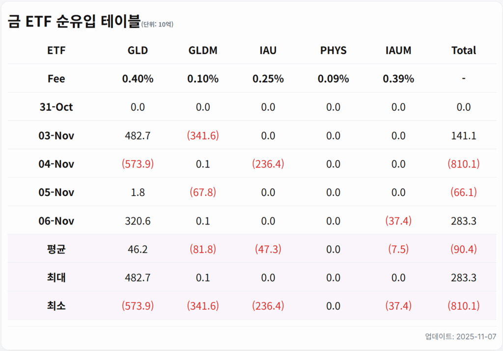 미국 금 ETF 자금흐름을 살펴보겠습니다. 11월 6일 기준, GLD +3206억 순유입, GLDM +1억 순유입, IAUM -374억 순유출로, 5개의 금 ETF에서 총 +2833억의 순유입이 발생했습니다.