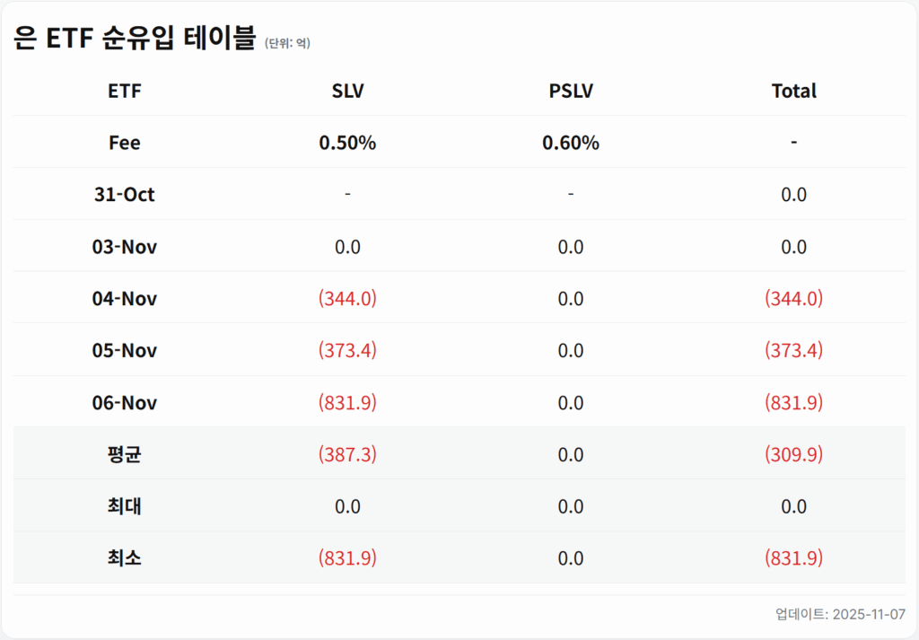 미국 은 ETF 자금흐름 살펴보겠습니다. 11월 6일 기준, SLV -831.9억 순유출로, 2개의 은 ETF에서 총 -831.9억의 순유출이 발생했습니다.