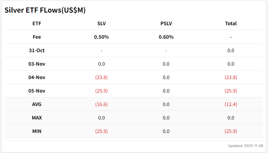 On Nov 5 (U.S. session), SLV recorded a net outflow of about -$25.9M. Across the two silver ETFs, the total net flow was about -$25.9M(outflow).