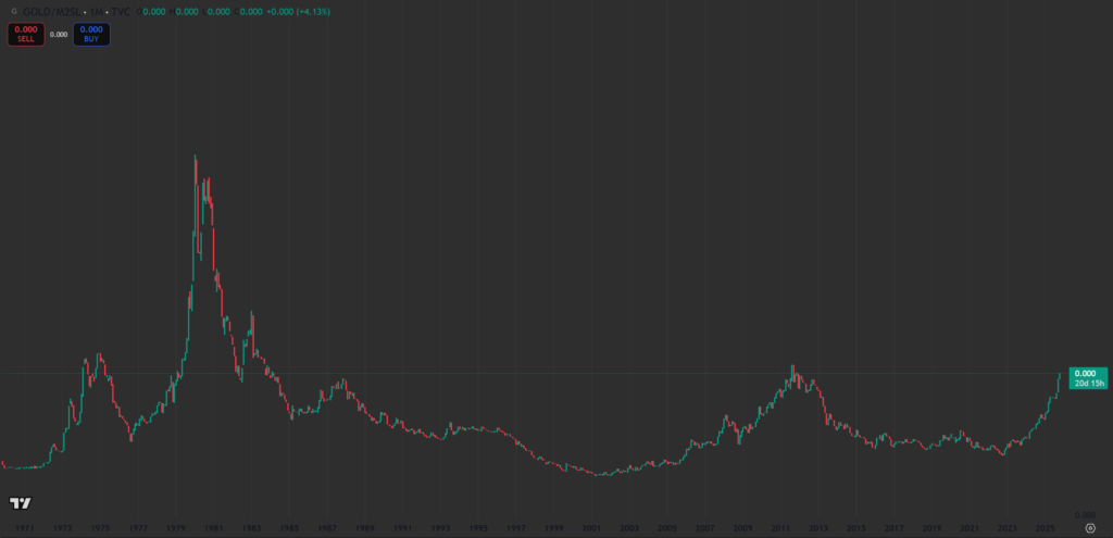 - 비율 하락 = 통화량이 더 빨리 늘었거나 금이 상대적으로 덜 올랐다.