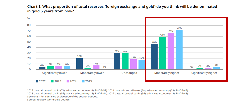 A. WGC 설문에선 향후 5년간 금 비중 증가 응답이 다수입니다. 다만 매입 속도와 가격 구간은 유동적이니 월간 통계를 확인해야 합니다.