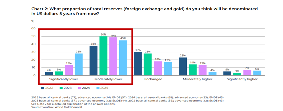 반면, “향후 5년 중앙은행 준비자산에서 달러 비중이 얼마나 될 것인가?”라는 질문에는 응답자의 73%가 낮아질 것으로 답변했습니다.