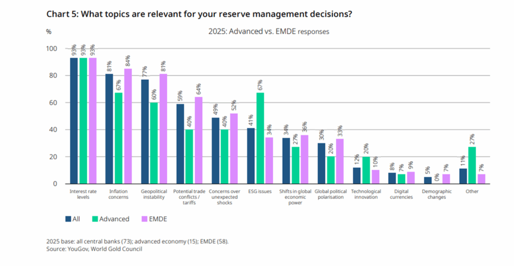 세계금협회의 2025년 설문에서, 중앙은행들은 준비자산 운용의 핵심 요인으로 다음을 꼽았습니다.